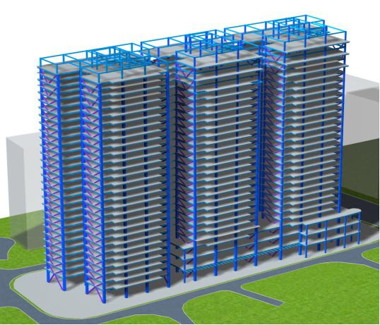 整個項目分為三個單元,1單元地下一層,地上27層;2單元和3單元地下一層,地上26層;采用鋼框架-中心支撐結構體系。