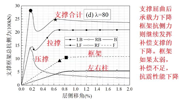 圖2 框架50%支撐50%,長細(xì)比80時(shí)(各構(gòu)件對(duì)抗側(cè)力的貢獻(xiàn)拆分出來看)