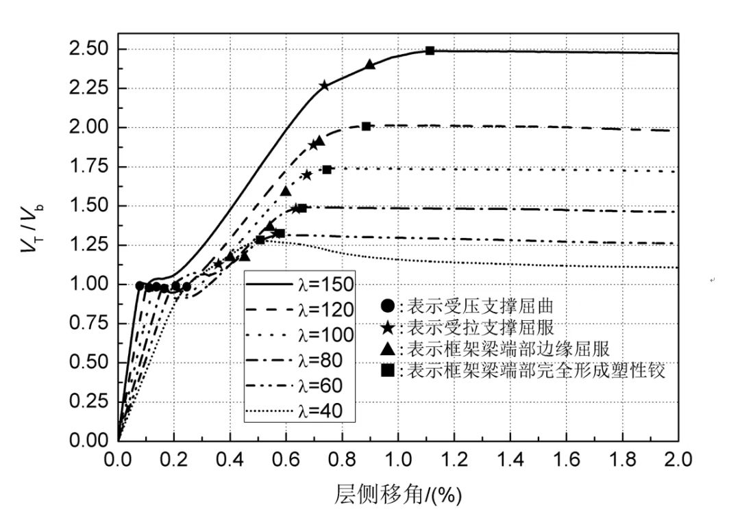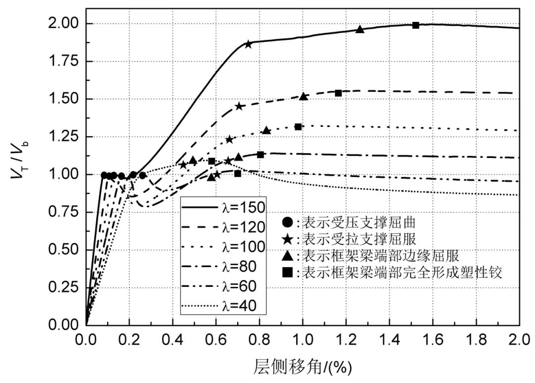 由圖3可見,長細(xì)比80、100時(shí),屈曲后承載力仍有少量下降,但隨側(cè)移增加、框架的抗側(cè)力繼續(xù)發(fā)揮而恢復(fù)。